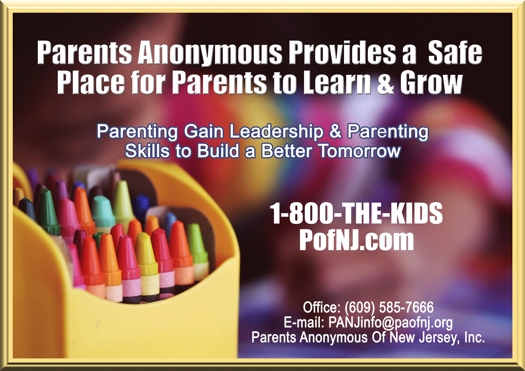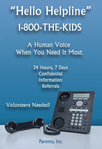 1-800-THE-KIDS is always answered by a caring volunteer who provides a listening ear, information, referrals and crisis intervention to parents and families in need.